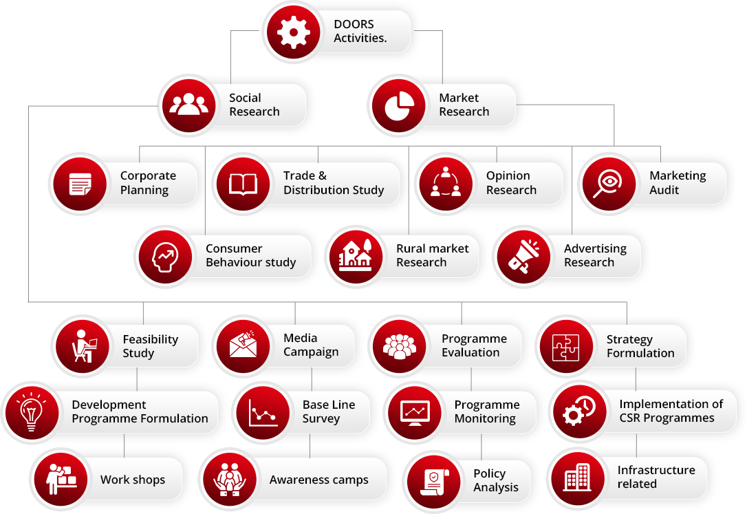 The professional services by DOORS Professionals include Socio- Economic, techno-economic and policy research assignment/surveys, Baseline surveys, End line surveys, Mid-term reviews, Impact assessment / Evaluation studies, Feasibility studies, Media campaigns, Policy research, Manpower Research, Training Needs Assessment, KAP (Knowledge Attitude Practice) studies, Area Development Project, Awareness Camps ( legal, environment, Health, facilities provided for weaker sections and minorities) Sample Check of DISE data, consumer satisfaction surveys, pre poll surveys and opinion polls, Free health camps and free dispensary under CSR schemes,, work regarding National Level Monitoring related to Rural Development, Drinking water and sanitation, Swatch Bharat Mission, Gram Swarojgar Yojana , Workshop on POSH ( Preventions of Sexual Harassment at working Place) market research studies, and studies on Behaviour Aspects, Perceptions and Aspirations, Population & Development, Poverty, Women & Child Development, Budget and Public Finance, Economic Development, Irrigation, Water Management and Wasteland Development, , Biodiversity including Medicinal Plants, Industry Status & Prospects, District & Block Plans, Rural Development, Health related issues, Rural Health Management, Beti Bachao Beti Padao, PPTCT ( Prevention of Parent to Child Transmission) services, Rural Industrialization, Information, Education & Communication, Food & Nutrition, , Environment & Natural Resource Management, Education related issues, Literacy campaigns, Scholarships, Adult Education, enrollment and dropouts, Panchayat Raj institutions etc.,